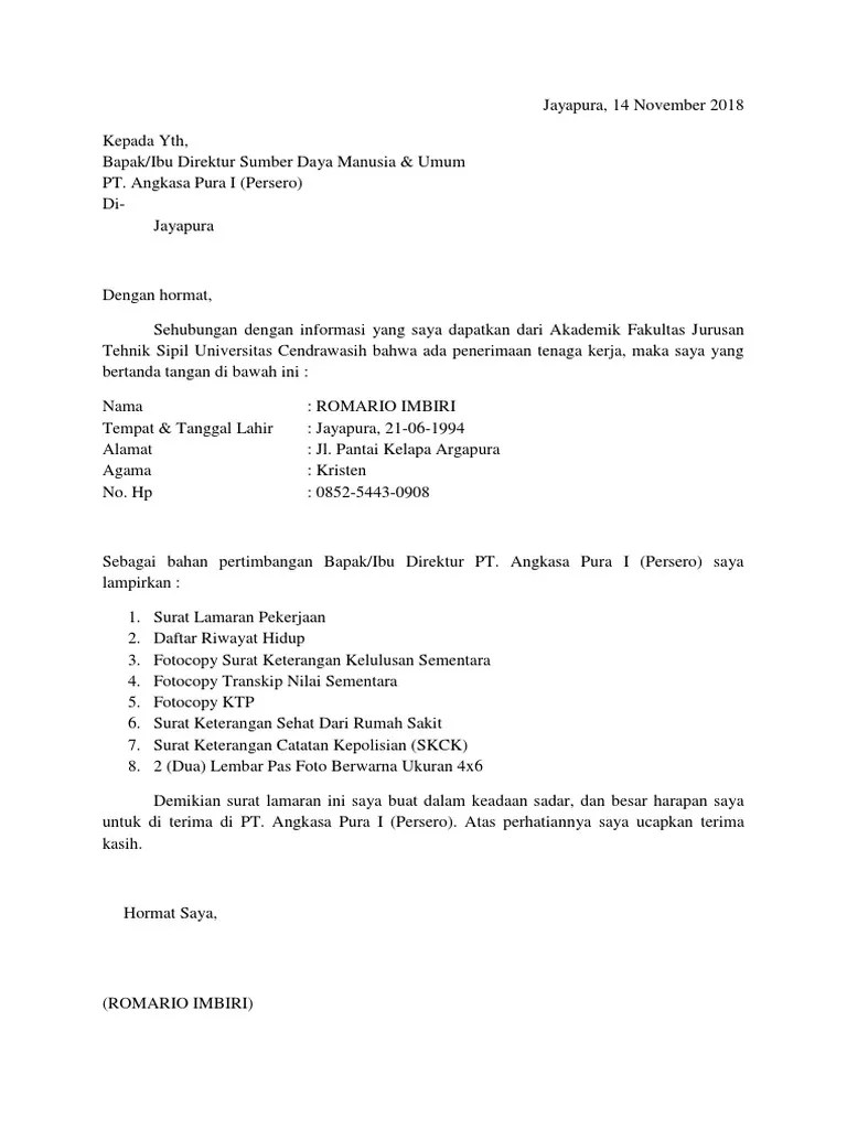 Contoh surat lamaran kerja di pt angkasa pura 2 | surat.